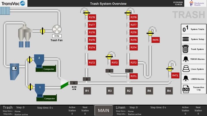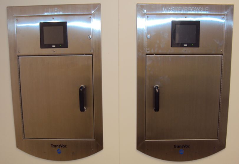 TransVac tøy- og avfallshåndteringssystem transporterer materialer gjennom et forseglet, dedikert rørnettverk fra lastestasjoner plassert på pasientgulv direkte til en sentral innsamlingsoperasjon med hastigheter på 96 km i timen. Avfall, resirkulering og skittent sengetøy transporteres i separate kanaler til passende innsamlingsbeholdere. Det er ikke lenger nødvendig med gravitasjonsrenner, vogner og søppelcontainere. Disse kostbare, unødvendige anordningene blir noe fra fortiden.